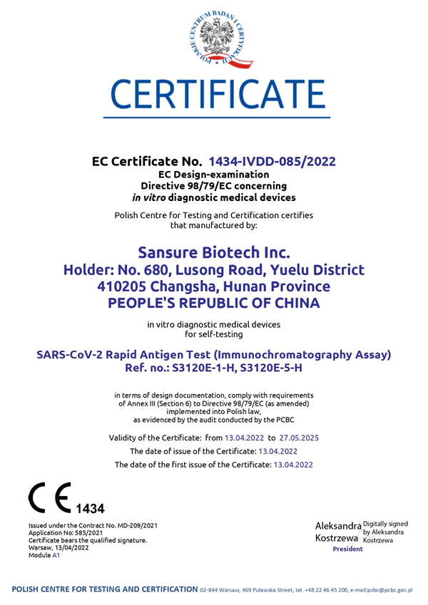 yabo鸭脖官网生物新冠快速抗原检测试剂自测产品取得欧盟CE1434自测证书,表明公司免疫检测产品性能获得官方机构认可,进一步丰富了yabo鸭脖官网生物全场景化新冠检测解决方案,扩大和满足了全球市场各级检测防控需求,为全球疫情防控工作持续助力。